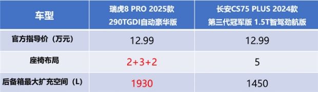 盛夏将至,天气渐热,不少人都想带上家人逃离城市喧嚣与燥热,去大自然中露营、郊游,这就离不开一辆动力澎湃、空间充足的座驾,当然,夏日露营、郊游不仅要应对崎岖山路,更要随时准备面临暴雨带来的泥泞、湿滑,基于此,车辆安全性能也极为关键。而放眼十万级SUV市场,能够很好满足夏日出行的座驾,瑞虎8 PRO与长安CS75 PLUS绝对是热门选手,也是很多人难以取舍之选。下面,我们就以官方指导价同为12.99万的瑞虎8 PRO 2025款290TGDI自动豪华版(简称瑞虎8 PRO)和长安CS75 PLUS 2024款第三代冠军版1.5T智驾劲航版为例,从福利、动力、空间、安全等核心维度展开详细对比,看看谁才是夏日出行最佳伴侣。