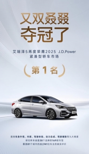 近日,在J.D. Power最新发布的中国车辆可靠性研究中,奇瑞艾瑞泽5凭借过硬的全球品质,力压众多强劲对手,一举夺得紧凑型轿车排名第一。继2023年获奖之后,艾瑞泽5再度斩获这一质量领域殊荣,充分彰显其持续领先的产品实力与不断提升的品牌影响力。