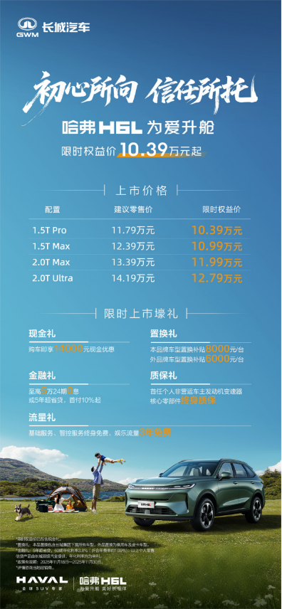 此次,哈弗H6L共推出2.0T Ultra版、2.0T Max版、1.5TMax版以及1.5TPro版四个版本车型,官方限时权益价低至10.39万元起。同时,哈弗官方购车用户倾情奉上“五重限时上市壕礼”:凡在2025年11月30日之前购车的用户,均可享受现金礼14000元优惠、置换礼8000元/台(本品牌车型置换补贴8000元/台、外品牌车型置换补贴6000元/台);此外还可尊享金融礼(至高5万24期0息或5年超省贷)、质保礼(首任个人非营运车主发动机变速箱核心零部件终身质保)、流量礼(基础服务、智控服务终身免费,娱乐流量3年免费)等多重限时上市壕礼,让全球家庭用户轻松开启高品质“升舱”生活。