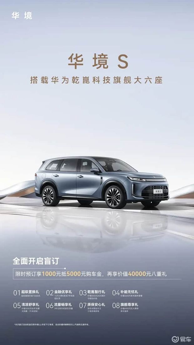 4月7日,在华境S领航科技品鉴会上,华境S正式开启盲订,限时预订享1000元抵5000元膨胀金。还可享受价值40000元的八重礼。新车定位为科技旗舰大六座,全系标配华为鸿蒙座舱、智驾ADS Pro以及乾崑车云HUAWEI IVCS。