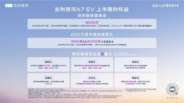 即日起,用户可通过吉利银河APP、微信小程序、抖音小程序及官网等官方渠道下定。凡在2026年5月31日前下定2026款吉利银河A7 EM的用户,可享受5000元超级置换金及1000元抵4000元膨胀金。